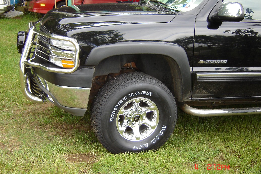 Here are some pics of the newest upgrade I've made to the truck, just in time to put it into storage while I run off to Guam, it seems. Taller, wider tires and new rims. I also lifted the front an additional 1.5-2" for tire clearance. |
